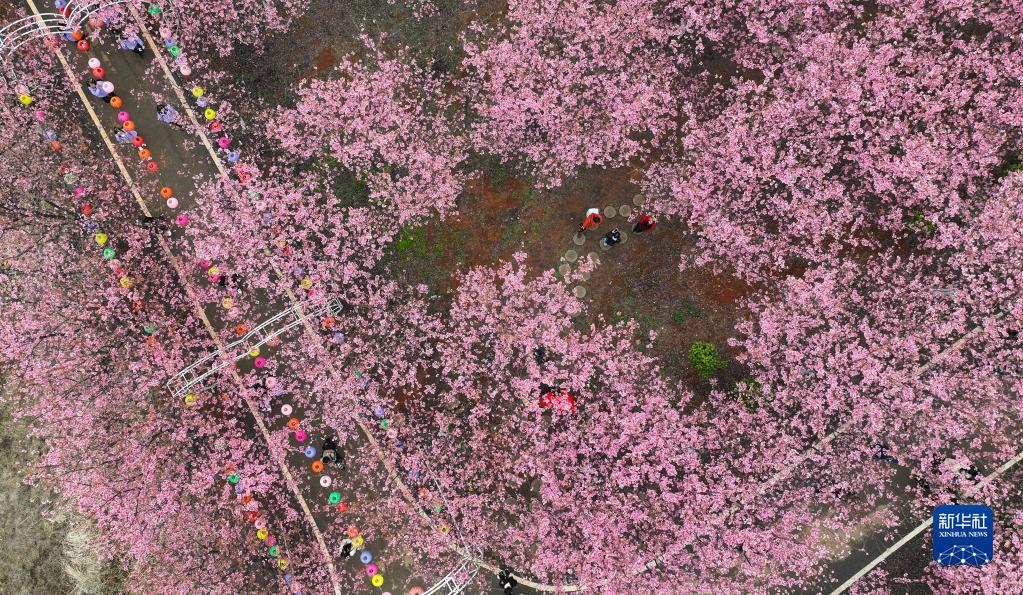3月4日,游人在常寧市羅橋鎮櫻花園內觀賞櫻花(無人機照片)。