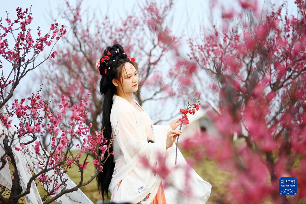 2月25日,古風愛好者在陜西省西安市秦嶺終南山腳下長安唐村梅園內留影。
