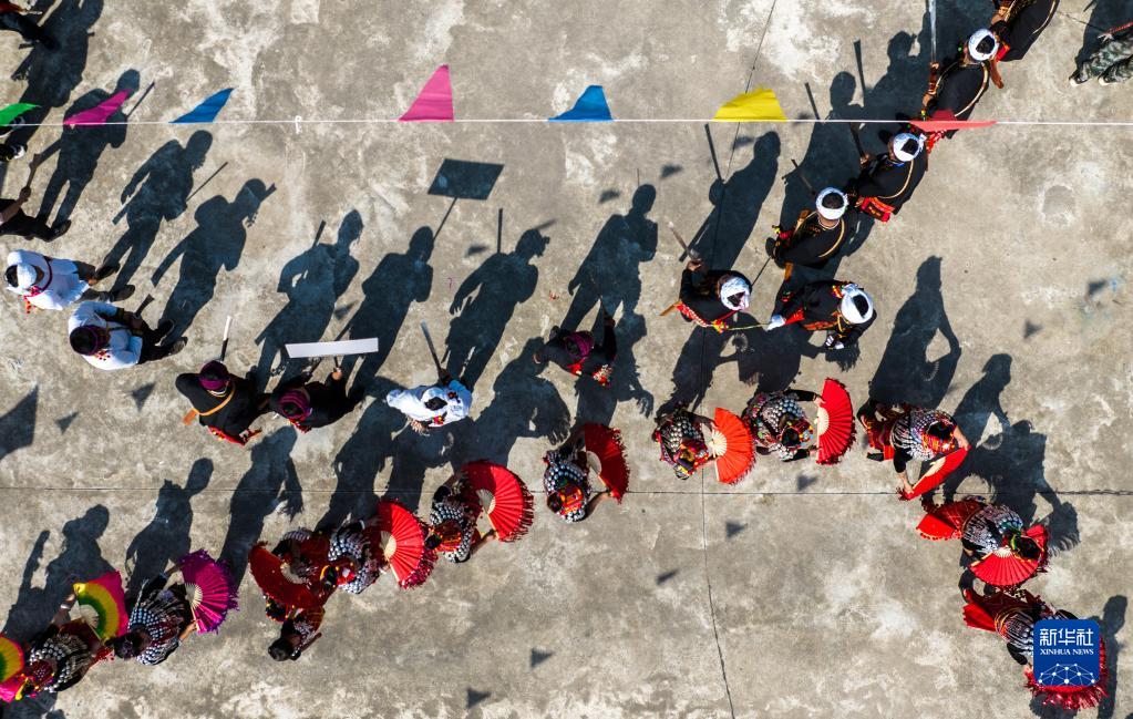 3月2日從空中俯瞰目瑙縱歌節現場(無人機照片)。當日,云南省德宏傣族景頗族自治州瑞麗市2023年目瑙縱歌節在位于中緬邊境的勐秀鄉戶瓦山寨開幕。