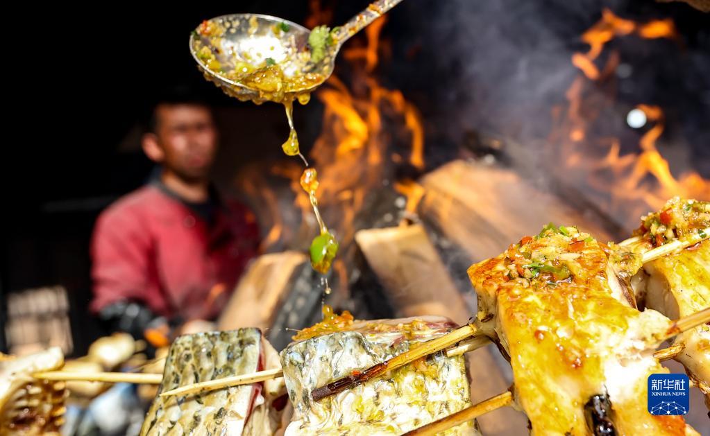 2月26日,在新疆喀什地區(qū)疏附縣托克扎克鎮(zhèn)農(nóng)貿(mào)市場的一處攤位前,攤主給炙烤的魚塊淋上料汁。