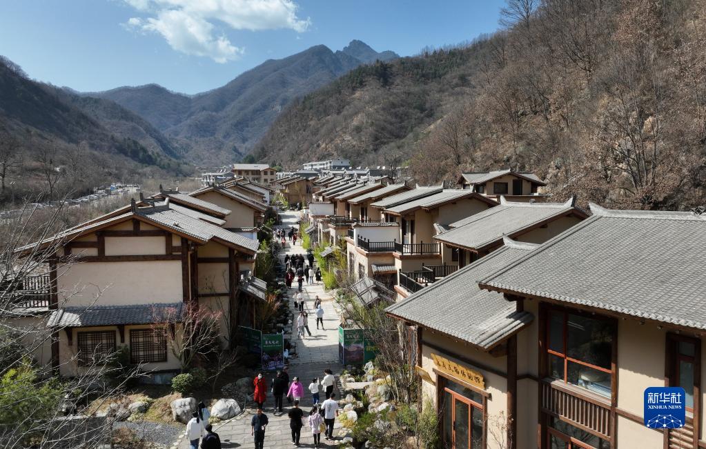 游客在利用閑置農舍改造而成的柞水縣終南山寨景區康養民宿街游覽(3月4日,無人機照片)。