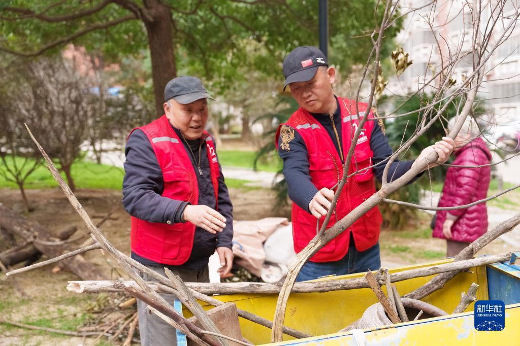 “小桔燈”服務社的志愿者在南昌市青云譜區徐家坊街道錦聯社區進行清理枯枝斷木的志愿服務(3月3日攝)。