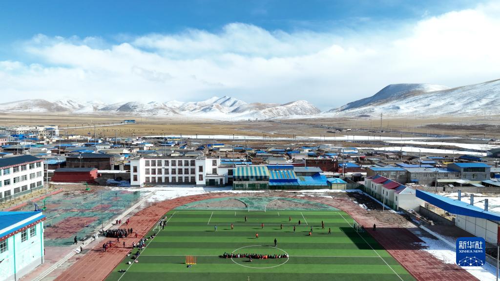 3月1日,在玉樹州曲麻萊縣,曲麻萊縣第一完全小學學生在足球課上(無人機照片)。