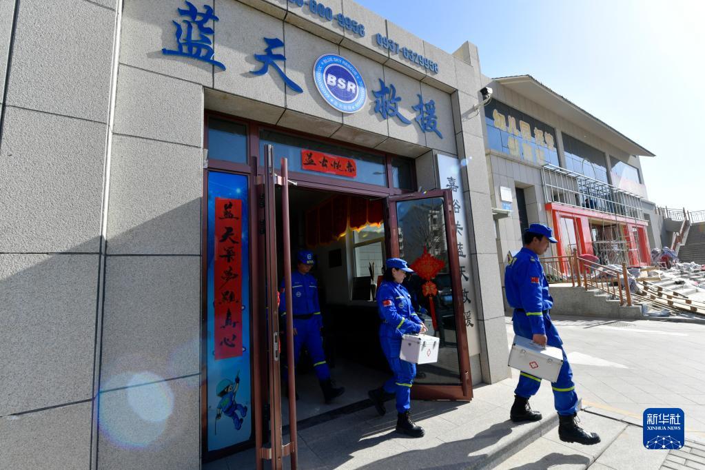 3月4日,劉富強(右)和隊員們走出嘉峪關藍天救援隊辦公室。