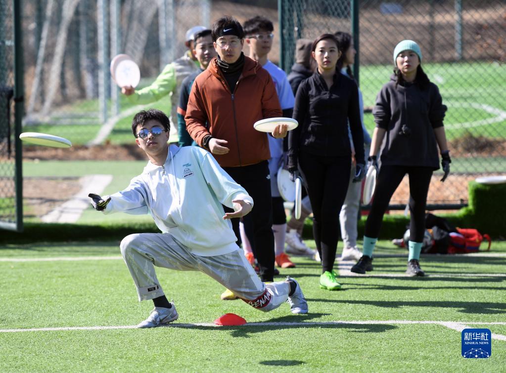 3月1日,在北京市朝陽區的東楓國際體育園,飛盤愛好者進行傳接盤練習。