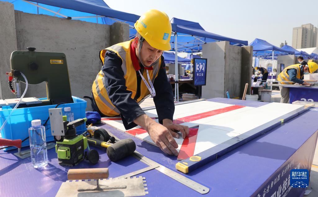 3月6日,參賽選手在進行裝飾裝修工(鑲貼工)項目比賽。