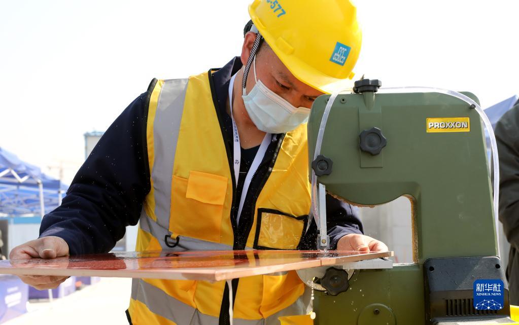 3月6日,參賽選手在進行裝飾裝修工(鑲貼工)項目比賽。