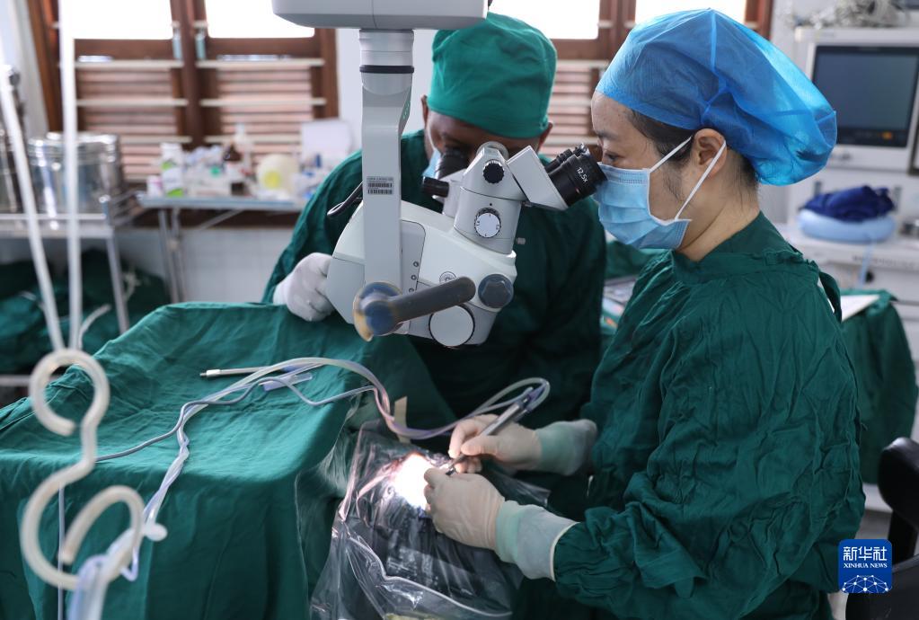 2月23日,在坦桑尼亞桑給巴爾島納茲莫加醫院,董莉莉為穆欣做白內障超聲乳化摘除手術。
