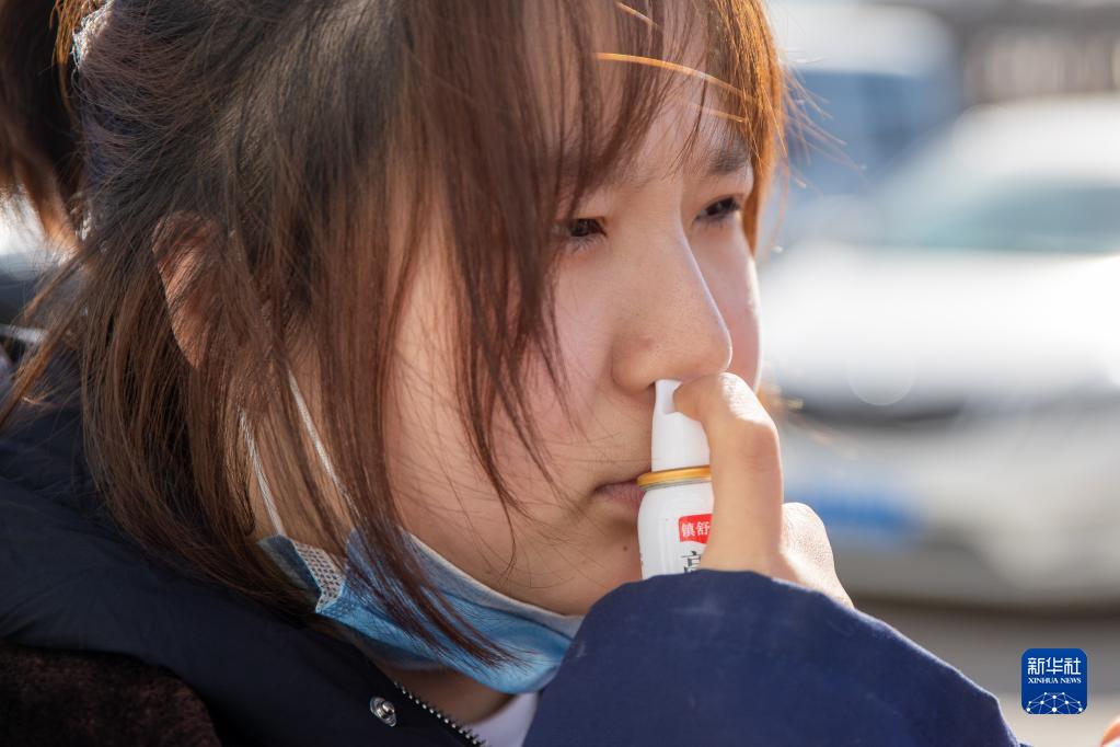 3月6日,在中國鐵路哈爾濱局集團有限公司大慶工務段杜爾伯特線路車間,女子檢驗班的苑鵬鵬在出發(fā)前用藥減輕身體不適。