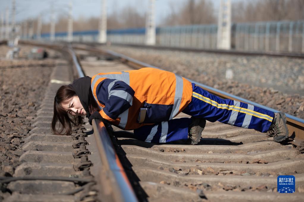 3月6日,在杜爾伯特火車站9號線,女子檢驗班的曹妍趴在鐵道線上觀察線路高低。