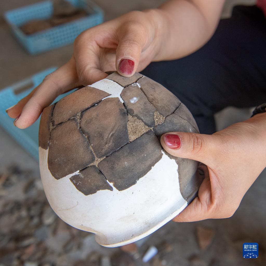 2022年10月19日,在位于重慶市涪陵區的小田溪墓群考古發掘現場臨時庫房內,燕妮在對一個剛完成拼對的陶器進行初步修復。