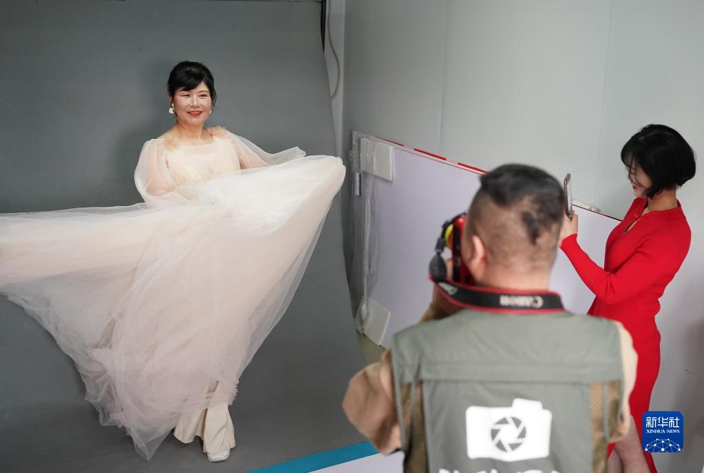 3月7日,在西安航天智能裝備產(chǎn)業(yè)基地建設(shè)項目現(xiàn)場一間辦公室內(nèi),攝影師在為女建筑工人拍照。