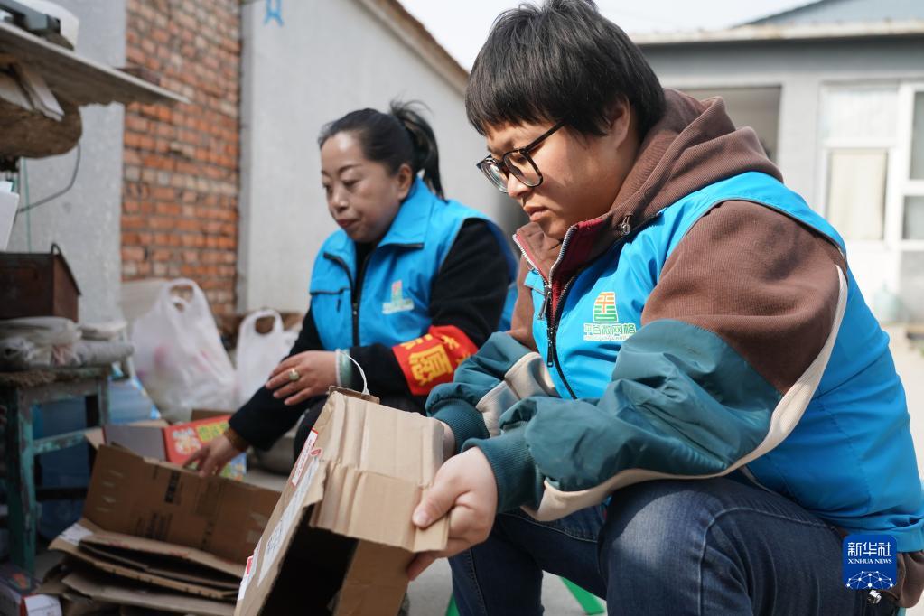 3月7日,在北京市峪口鎮(zhèn)西樊各莊村,王巖峰(右)與同事劉淑伶幫助村里一家老人整理院子。