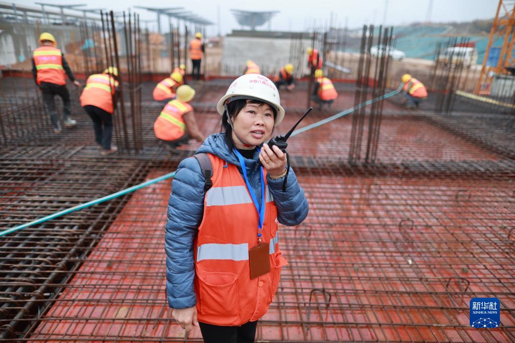 3月7日,中鐵八局女職工劉獻英在告知塔吊司機高鐵通過時間。
