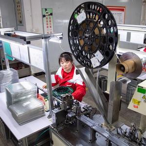 3月7日,在汨羅市神鼎山鎮豐倉村的“巾幗車間”,工作人員在生產數據線配件。