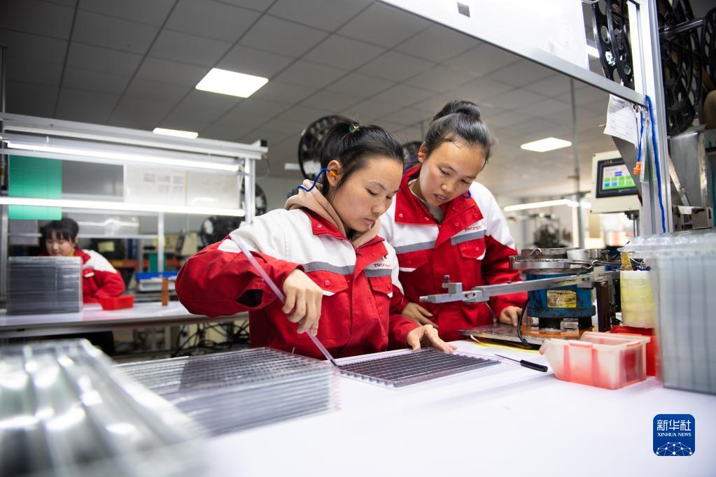 3月7日,在汨羅市神鼎山鎮豐倉村的“巾幗車間”,新入職的工作人員(右)在學習生產數據線。