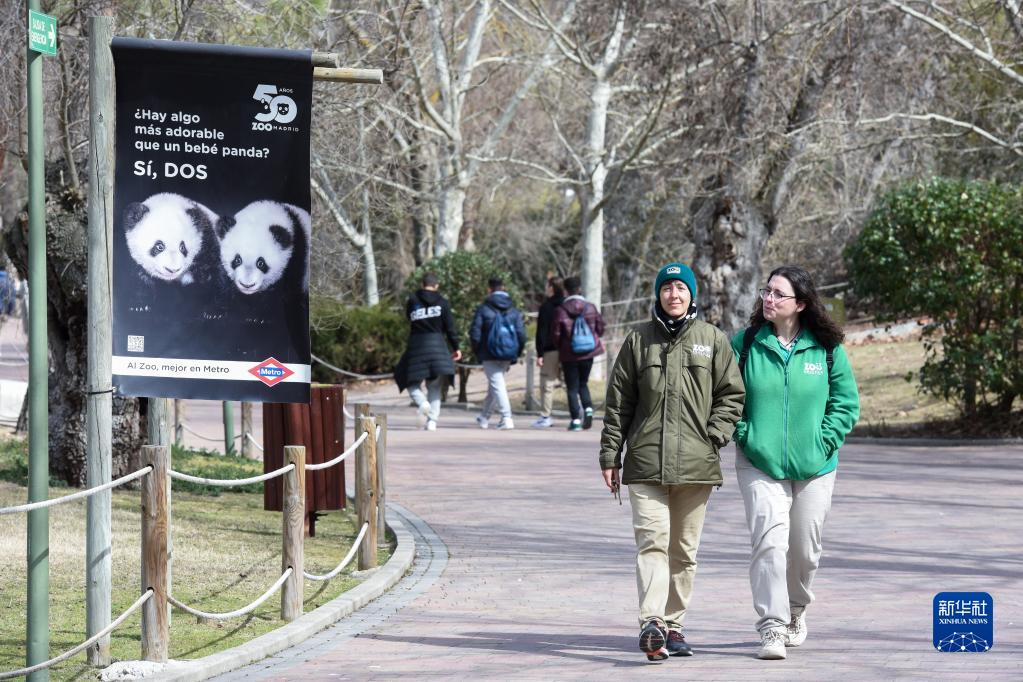 3月7日,人們經過西班牙馬德里動物園內的大熊貓雙胞胎海報。