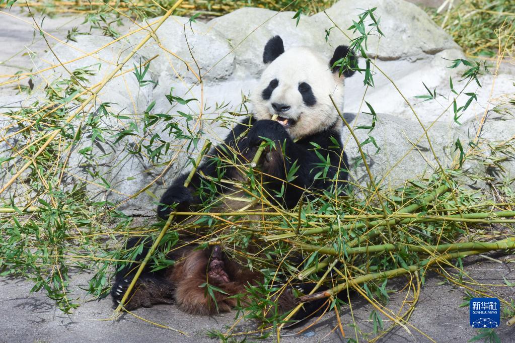 3月7日,大熊貓冰星在西班牙馬德里動物園內吃竹子。