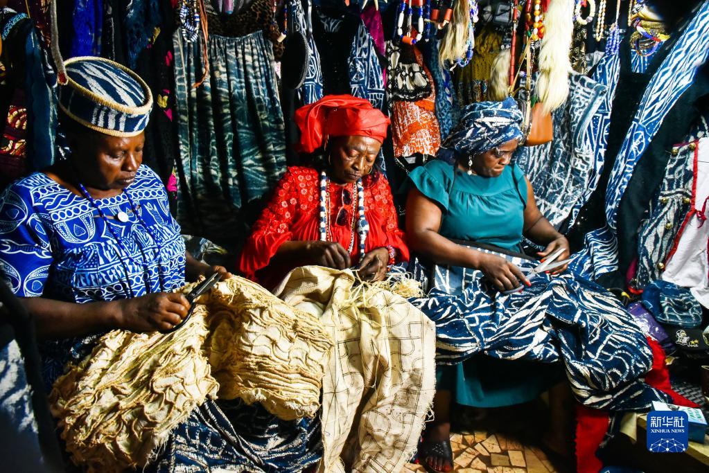 恩多普是主要流行于喀麥隆西部大區的一種布料,可以制成衣物、帽子和項鏈等。制作過程中,先用墨線在白色棉布上繪制紋樣,再用干燥的棕櫚葉脈做線把紋樣扎起來,經靛藍的植物染料浸染后,拆去棕櫚葉脈,便得到藍底白紋的恩多普。如今,眾多喀麥隆婦女投入恩多普制作領域,這不僅改善了她們的生活,也推動了文化的傳承。