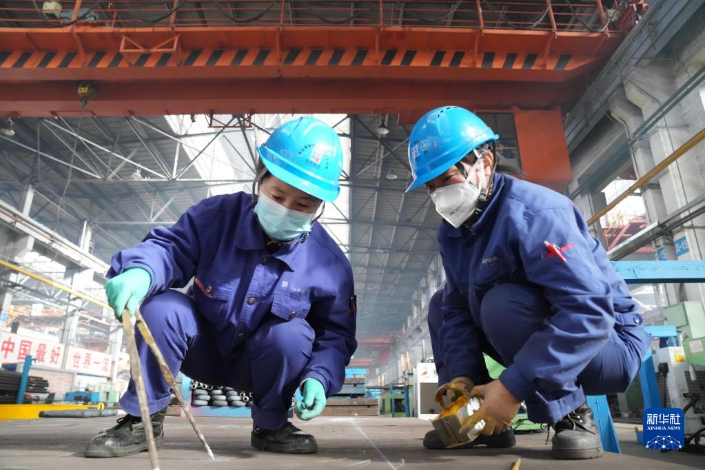 3月6日,哈電集團哈爾濱鍋爐廠有限責任公司劃線工劉歷(左)和劉莉莉在作業中。