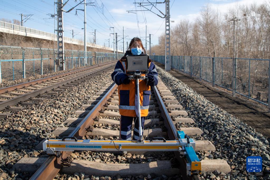 3月6日,大慶工務段杜爾伯特線路車間女子檢驗班的苑鵬鵬在濱洲線199公里處作業。