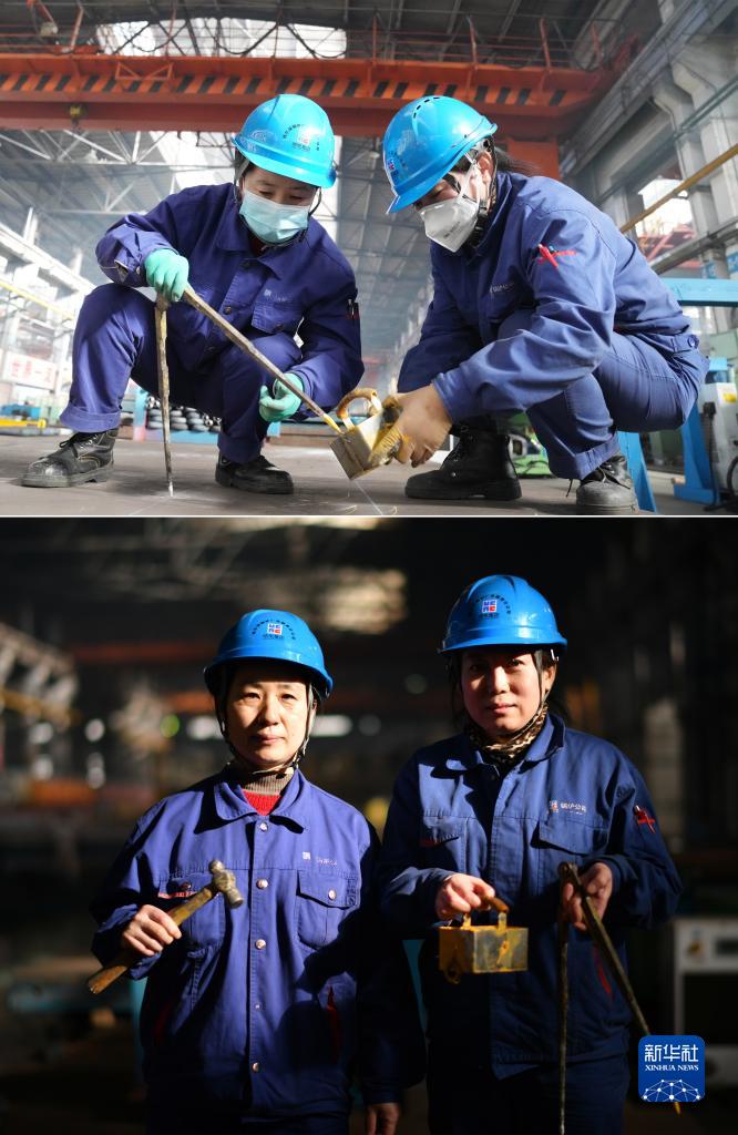 拼版照片:上圖為哈電集團(tuán)哈爾濱鍋爐廠有限責(zé)任公司劃線(xiàn)工劉歷(左)和劉莉莉在作業(yè)中;下圖為劉歷(左)和劉莉莉在生產(chǎn)車(chē)間(3月6日攝)。
