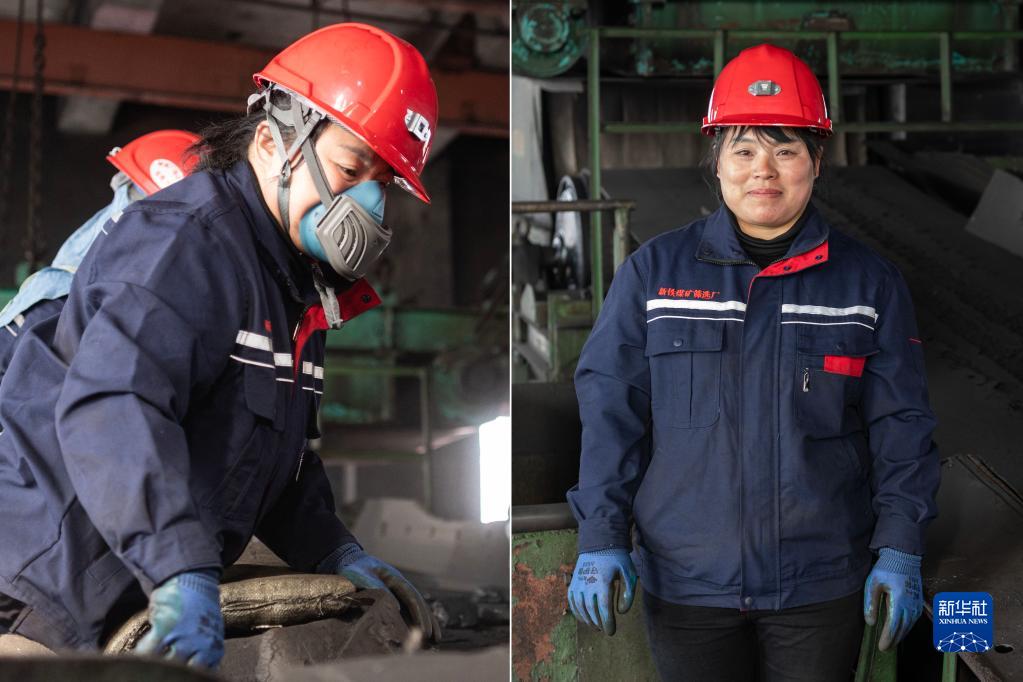 拼版照片:左圖為在黑龍江省七臺河市,龍煤集團(tuán)七臺河礦業(yè)公司新鐵煤礦篩選廠手選班班長曲兆香從動態(tài)煤堆中挑選矸石;右圖,曲兆香在崗位上留影(3月7日攝)。