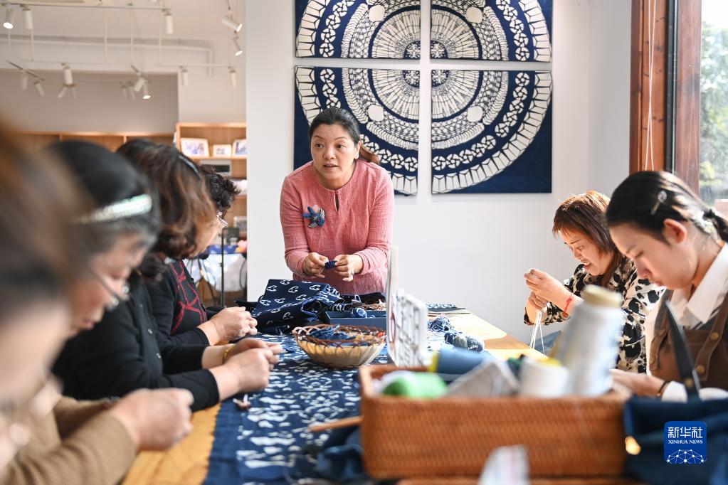 3月8日,在奉化區(qū)西塢街道雷山村“七彩巧婦”共富工坊,寧波市非物質(zhì)文化遺產(chǎn)藍(lán)印花布印染技藝代表性傳承人張劍峰(中)向村民演示手工飾品的制作方法。目前,該工坊已帶動雷山村30余位女性開展來料加工制作。