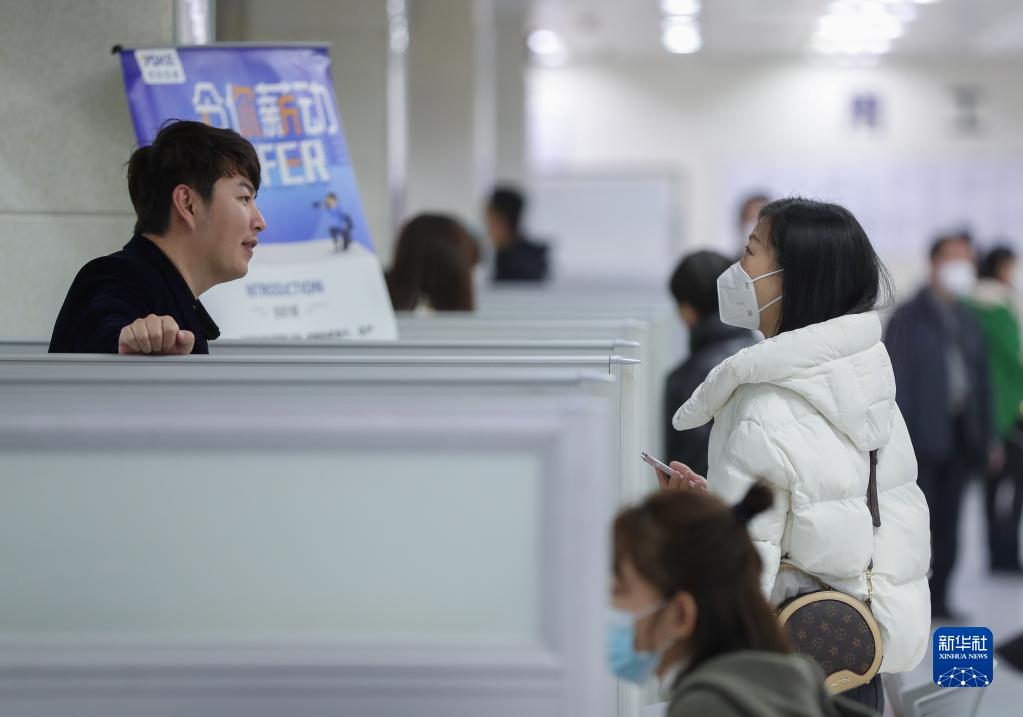3月8日,在大連市人力資源市場,求職者與招聘企業工作人員交流。