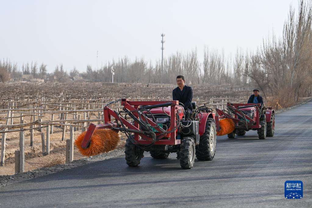 3月8日,在吐魯番市高昌區葡萄鎮,農民駕駛開墩機前往葡萄田。