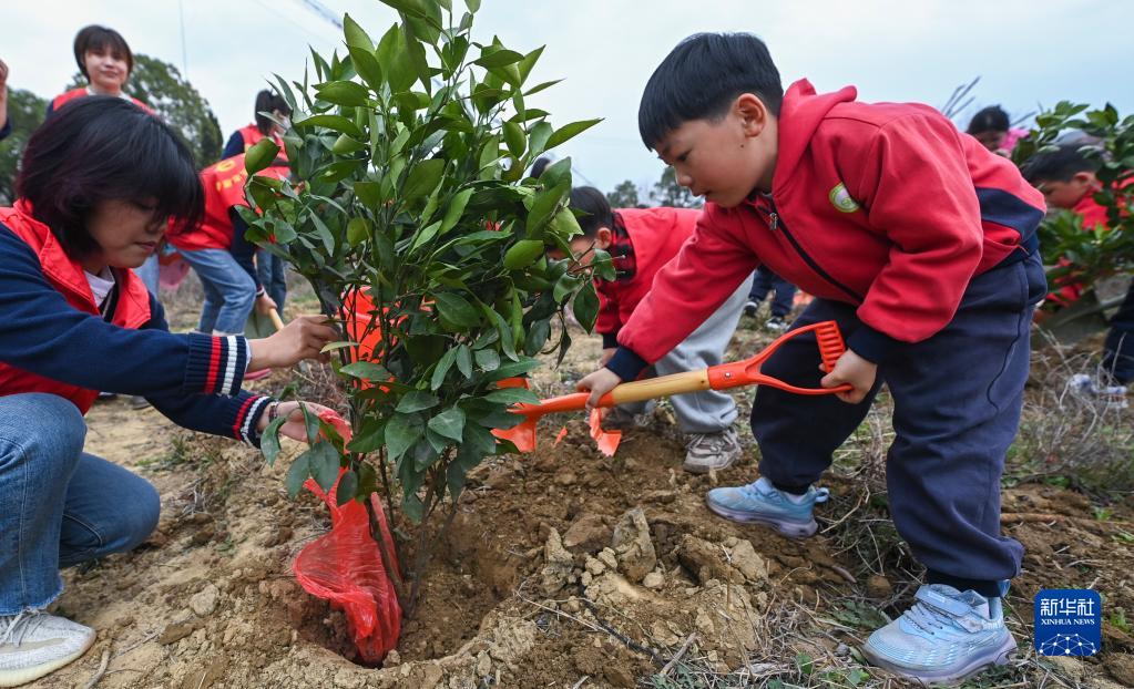 3月8日,在長興縣李家巷鎮青草塢村的荒地上,孩子們在老師和青草塢村黨員志愿者的帶領下一起種下橘子樹苗。
