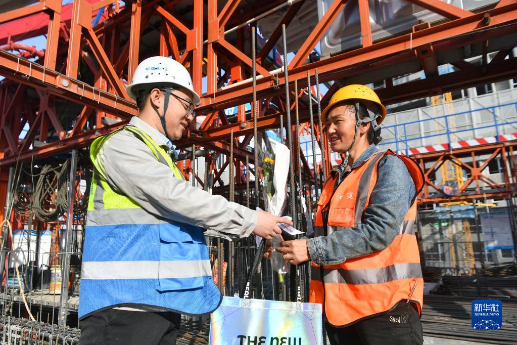 3月8日,在陜西省西安市未央區一處建筑工地,中建三局西北公司鋼筋工賈元會(右)收到項目管理人員贈送的節日禮品。