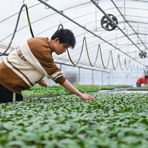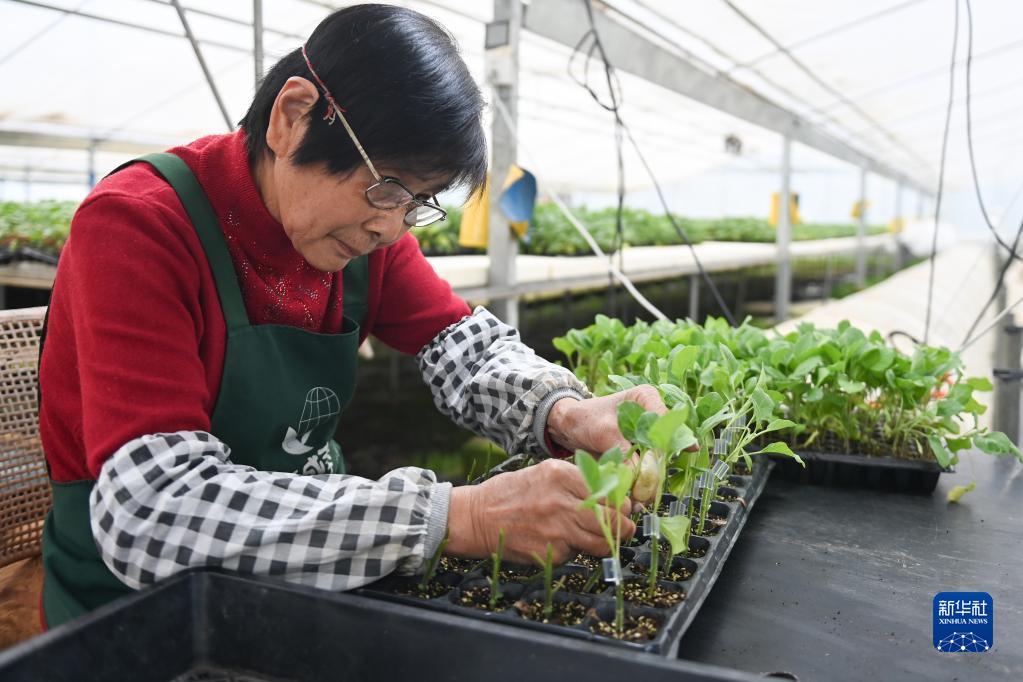3月8日,工作人員在杭州市臨平區(qū)的杭州康成農(nóng)業(yè)科技有限公司的溫室內(nèi)嫁接菜苗。