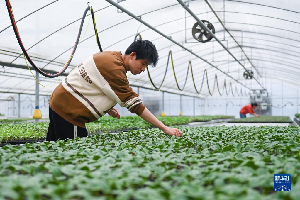 3月8日,工作人員在杭州市臨平區(qū)的杭州康成農(nóng)業(yè)科技有限公司的溫室內(nèi)查看菜苗長(zhǎng)勢(shì)。