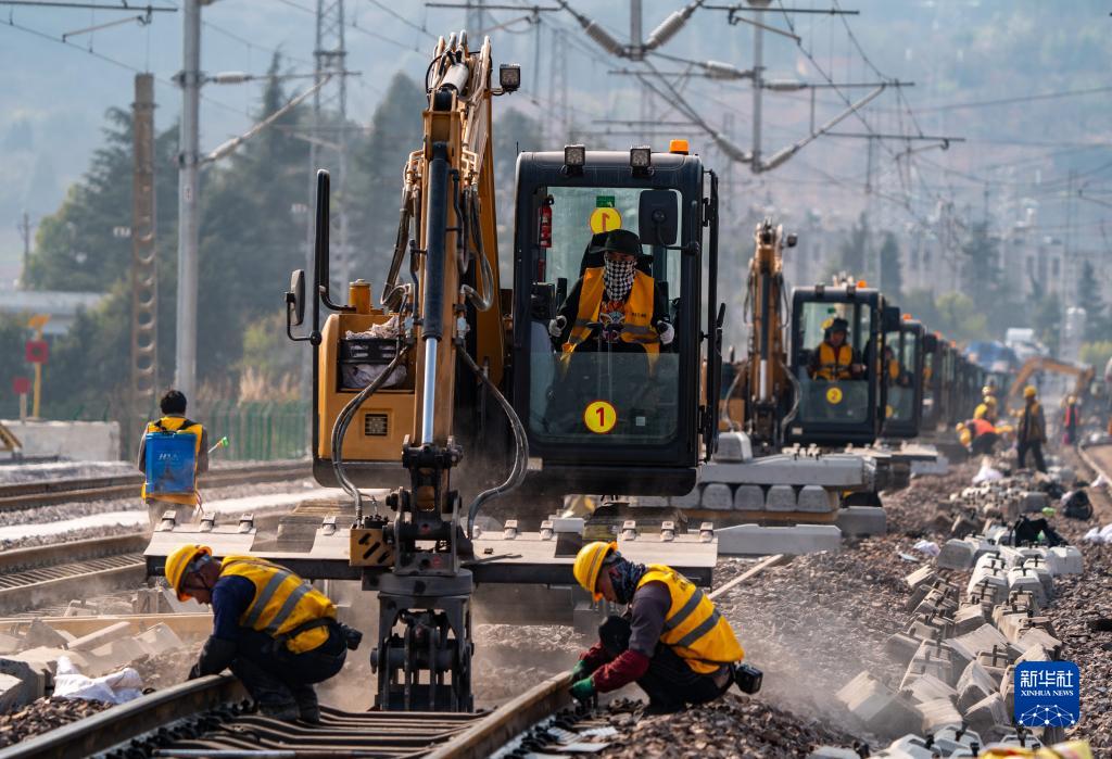 作業人員操作換枕設備對鐵路進行換枕作業(3月8日攝)。