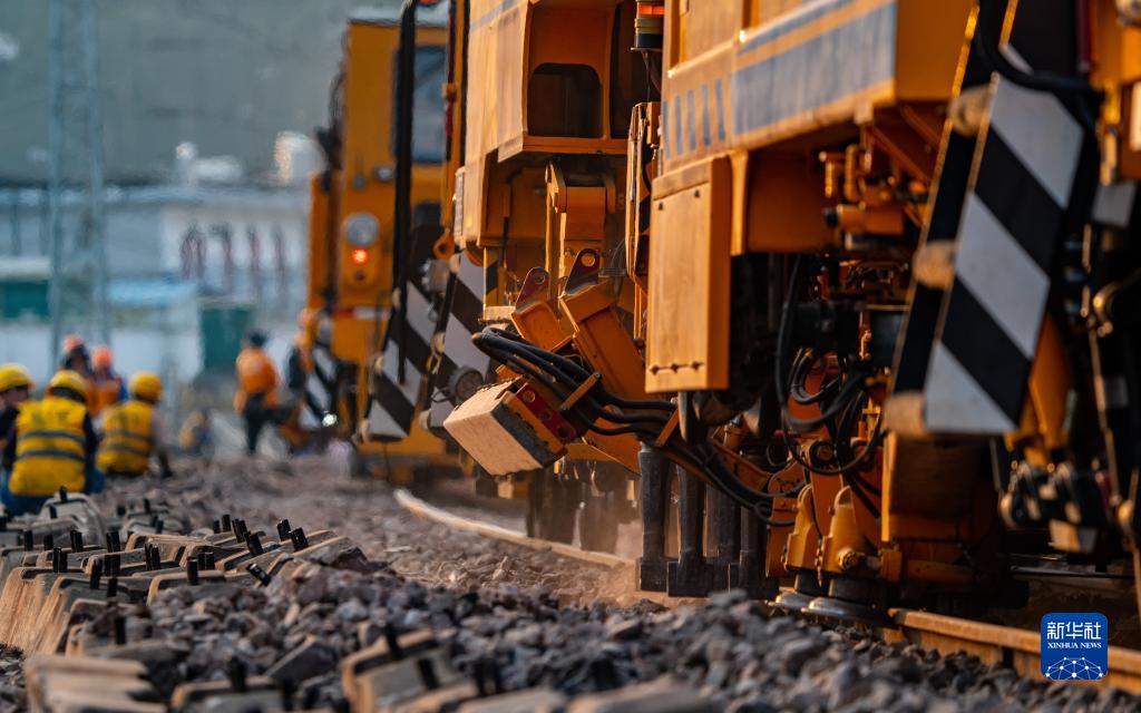 養(yǎng)路機械沿著鐵路進行線路搗固作業(yè)(3月8日攝)。