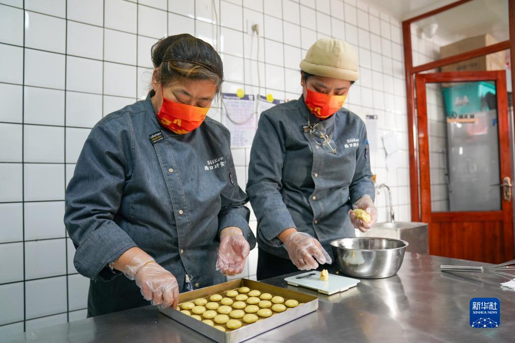 在北京市密云區金叵羅村的西口研食社內,劉甜恬(右)和“三嫂子”楊紅艷一起制作小米酥(2022年10月20日攝)。