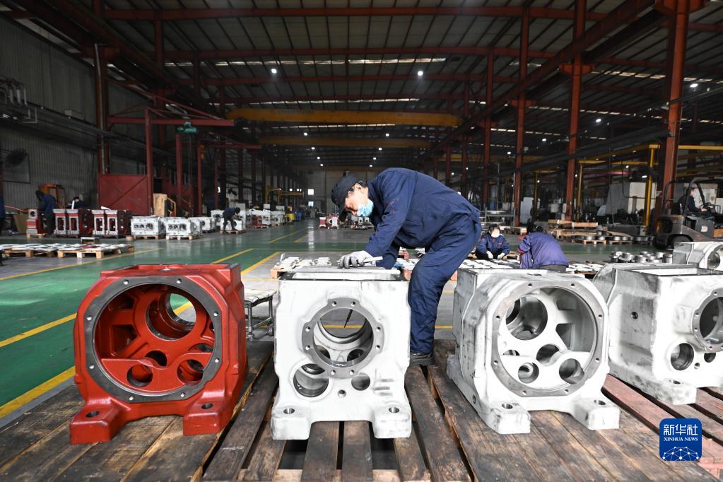在天津市一家科技公司,工人在生產車間內對風電組件加工作業(3月8日攝)。
