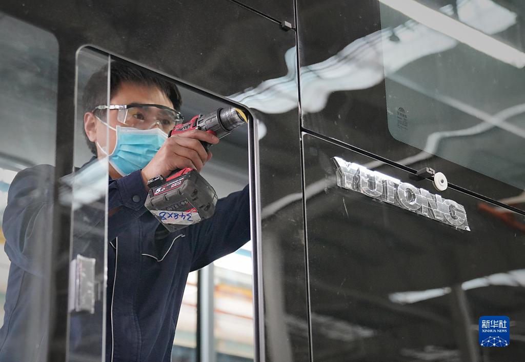 3月8日,工作人員在宇通新能源廠區高端及海外承裝車間裝配車輛內飾。