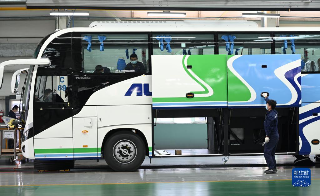 近日,在位于河南省鄭州市的宇通新能源廠區高端及海外承裝車間里,工作人員在流水線上忙碌地趕訂單生產。今年以來,宇通客車海外出口持續走熱,相繼獲得多個海外訂單。據介紹,截至目前,宇通客車已遠銷30多個國家和地區。