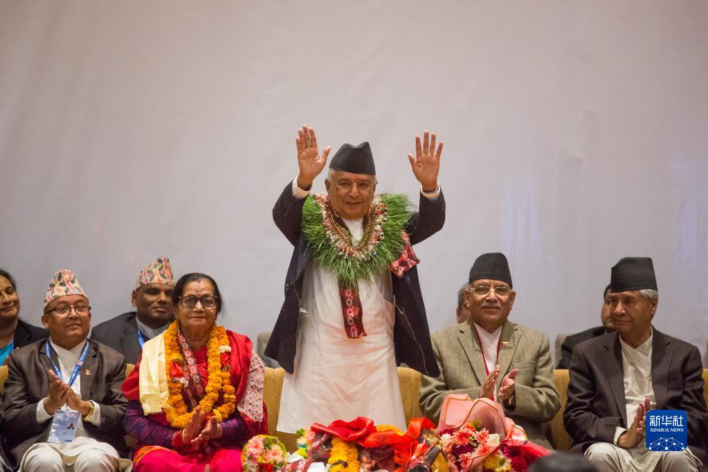 3月9日,在尼泊爾加德滿都,尼泊爾大會黨領導人拉姆·錢德拉·保德爾(中)在總統選舉勝出后揮手致意。
