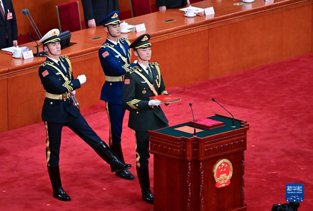 3月10日,中華人民共和國第十四屆全國人民代表大會第一次會議憲法宣誓儀式在北京人民大會堂舉行。主席臺上,3名禮兵邁著正步護送《中華人民共和國憲法》入場。
