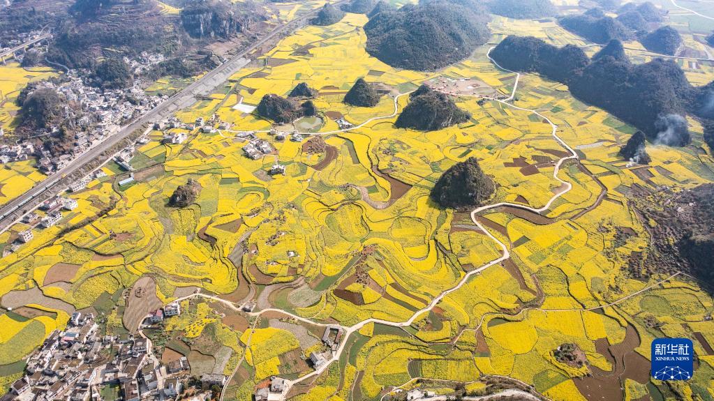 近日,貴州省六盤水市六枝特區(qū)木崗鎮(zhèn)的16000余畝油菜花競相綻放,與田地、民居、道路構(gòu)成了美麗的春日畫卷。