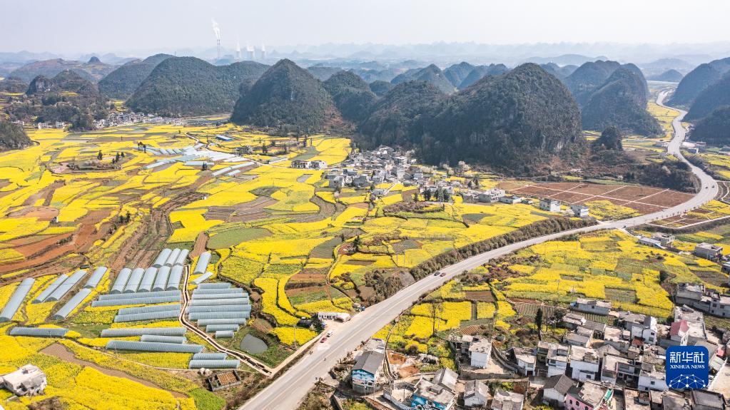 近日,貴州省六盤水市六枝特區木崗鎮的16000余畝油菜花競相綻放,與田地、民居、道路構成了美麗的春日畫卷。