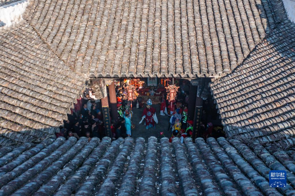 3月10日,在浙江省杭州市淳安縣屏門鄉屏前村的老祠堂內,人們在觀看表演(無人機照片)。