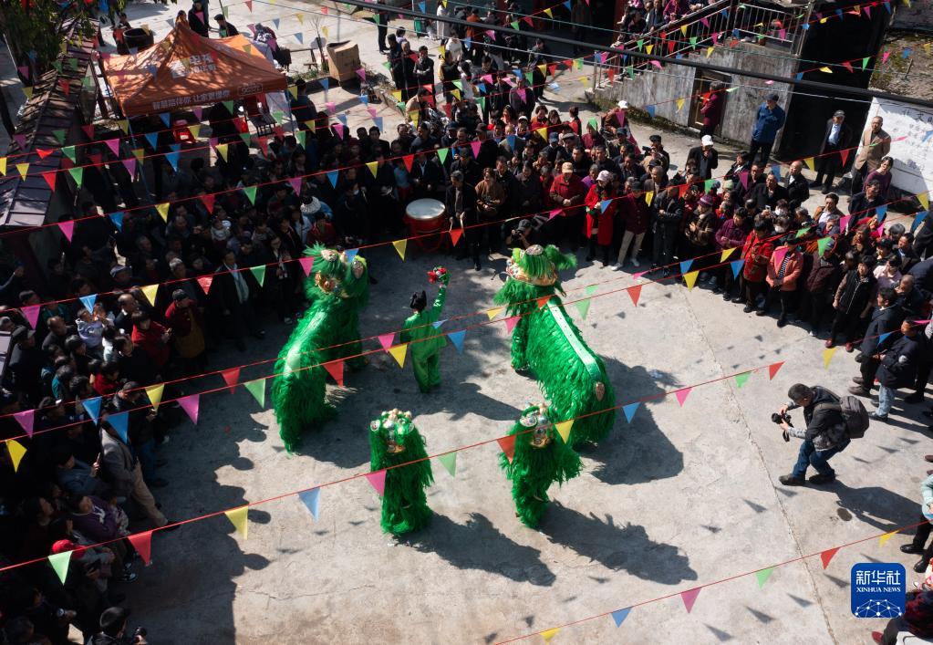 3月10日,在浙江省杭州市淳安縣屏門鄉(xiāng)屏前村的傳統(tǒng)廟會上,人們在觀看“齊坑綠獅”表演(無人機(jī)照片)。