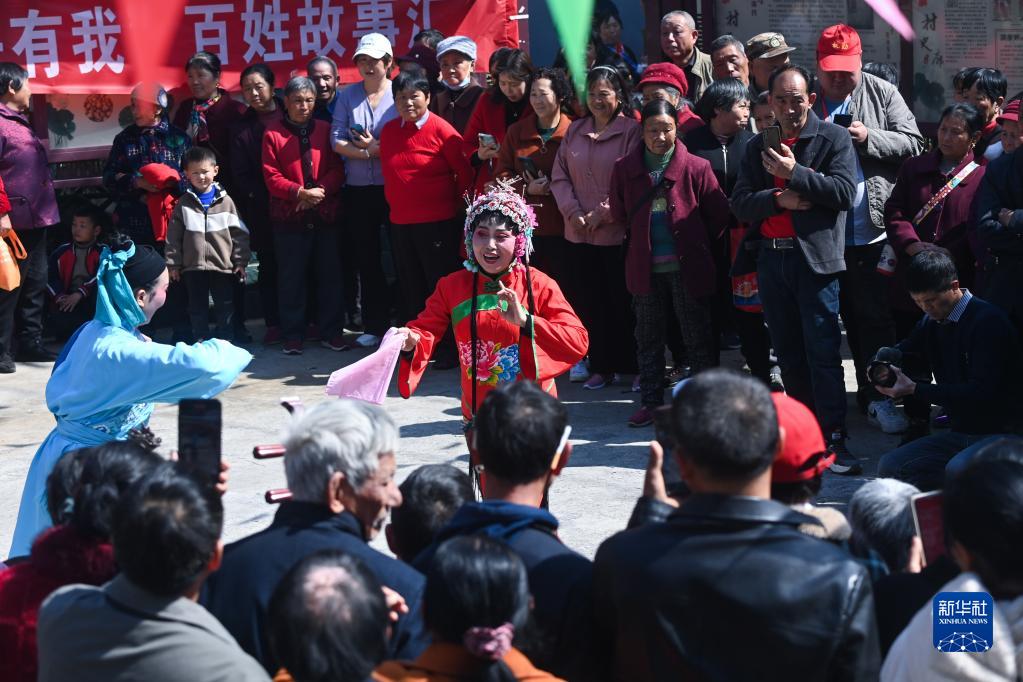 3月10日,在浙江省杭州市淳安縣屏門鄉(xiāng)屏前村的傳統(tǒng)廟會(huì)上,人們?cè)谟^看屏門睦劇表演。
