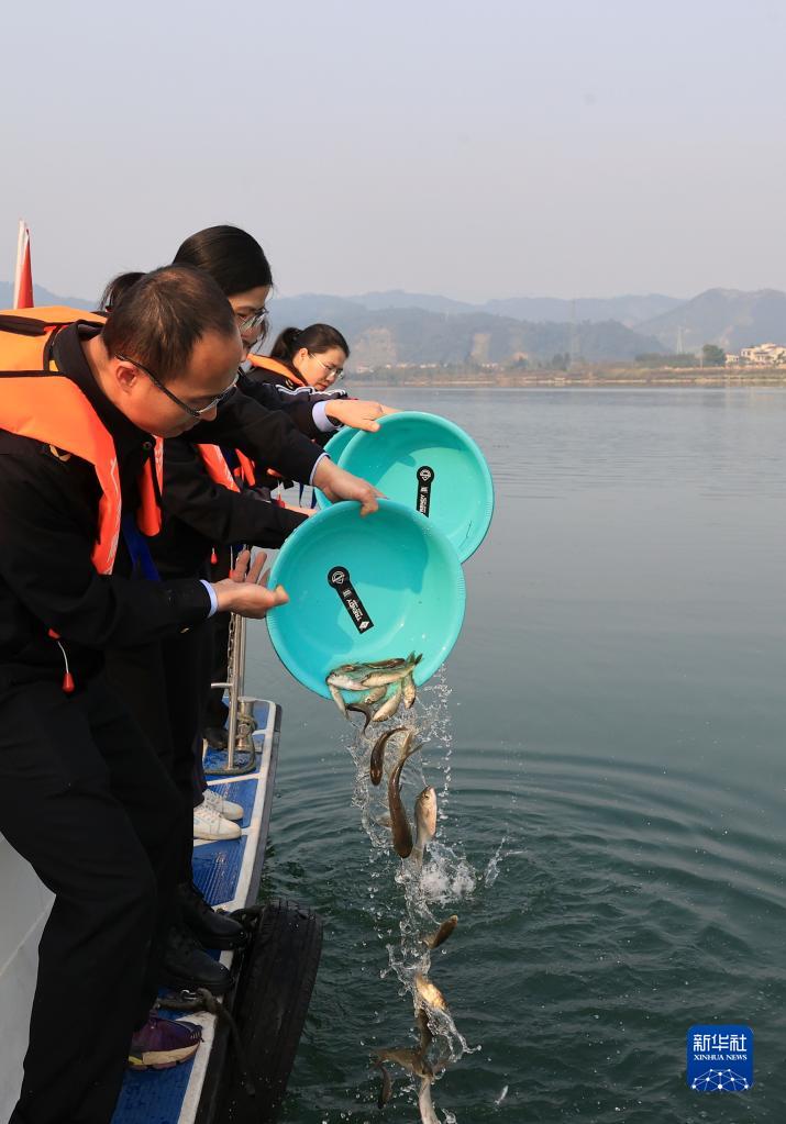 當日,廣西柳州市融安縣舉行2023年春季植樹暨漁業資源增殖放流活動,當地工作人員、市民和學生在珠江支流融江沿岸種植樹木,并將5萬余尾鯉魚、鯽魚、鳙魚等魚苗放流江中,增加水域魚類群體數量,改善水域生態環境。
