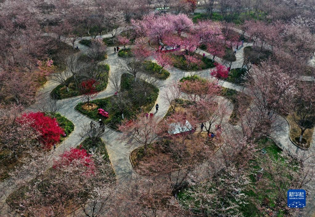 這是3月10日拍攝的滎陽(yáng)市古柏渡豐樂(lè)櫻花園(無(wú)人機(jī)照片)。