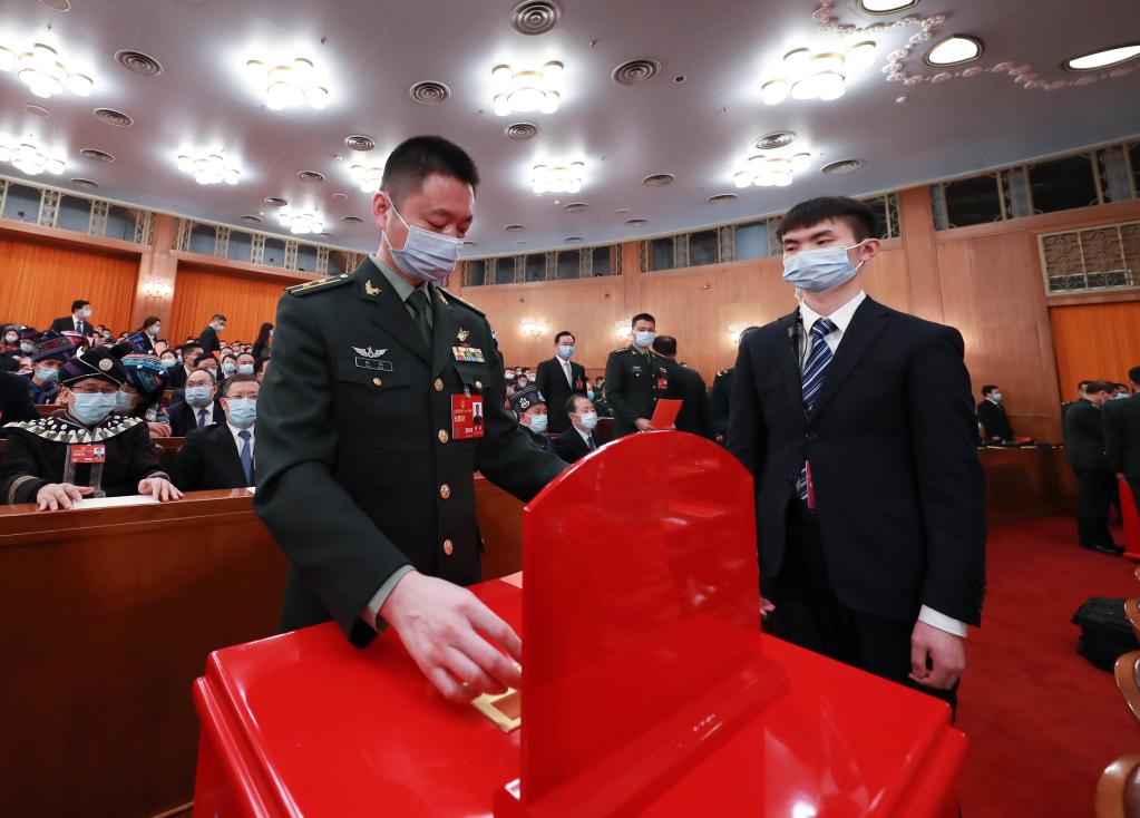 3月10日,十四屆全國人大一次會(huì)議在北京人民大會(huì)堂舉行第三次全體會(huì)議。這是代表在投票。